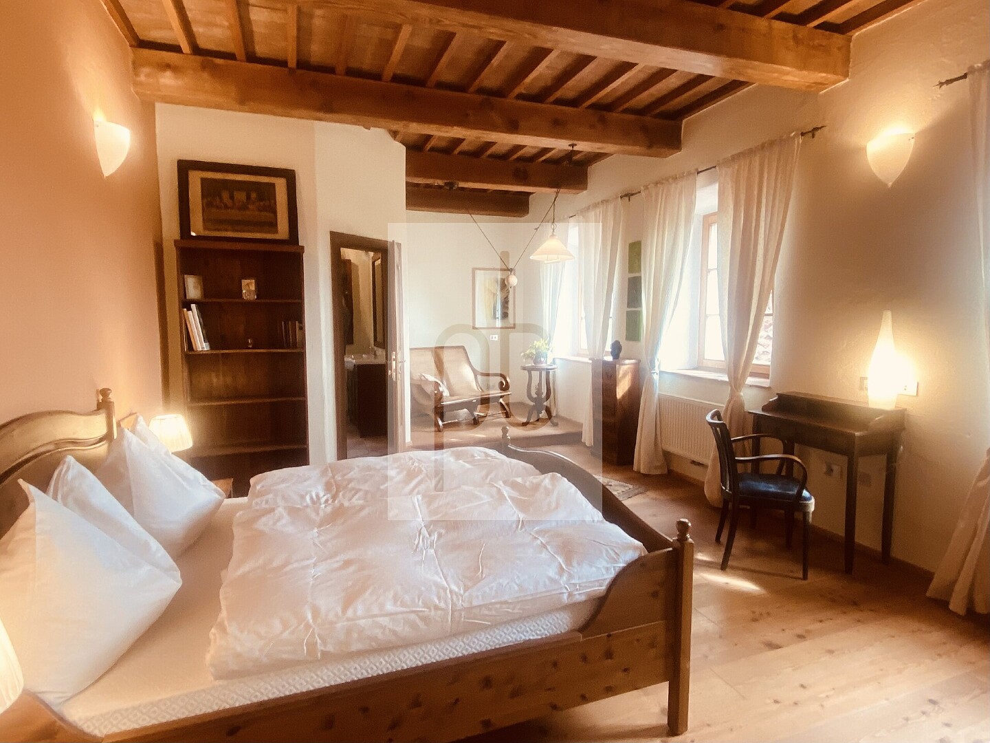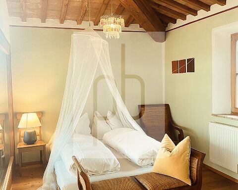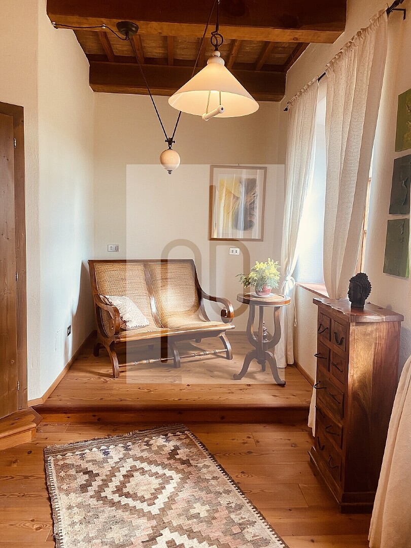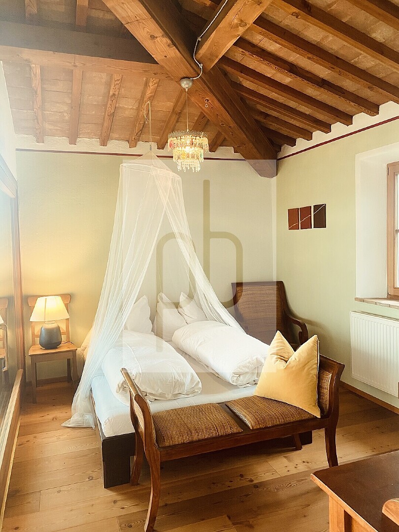 Bereits beim Betreten entfaltet die Immobilie ihren besonderen Charme: Der Eingang führt in ein großzügiges Wohnzimmer mit Wohnküche und offenem Kamin oder über einen separaten Zugang in das Treppenhaus sowie in ein exklusives Appartement mit integriertem historischem Backofen. Im ersten Obergeschoss befinden sich ein eleganter blauer Salon mit Rautenparkett aus Zirbe und Lärche, eine Terrasse sowie zwei Appartements mit eigenem Zugang. Ein besonderes Highlight ist das oberste Stockwerk mit seiner von Travertinsäulen gerahmten, überdachten Terrasse. Ergänzt wird diese Ebene durch ein stilvolles Bad mit Travertinplatten, eine maßgefertigte Einbauküche aus Lärche, einen großzügigen Wohn- und Schlafbereich sowie ein weiteres Zimmer.