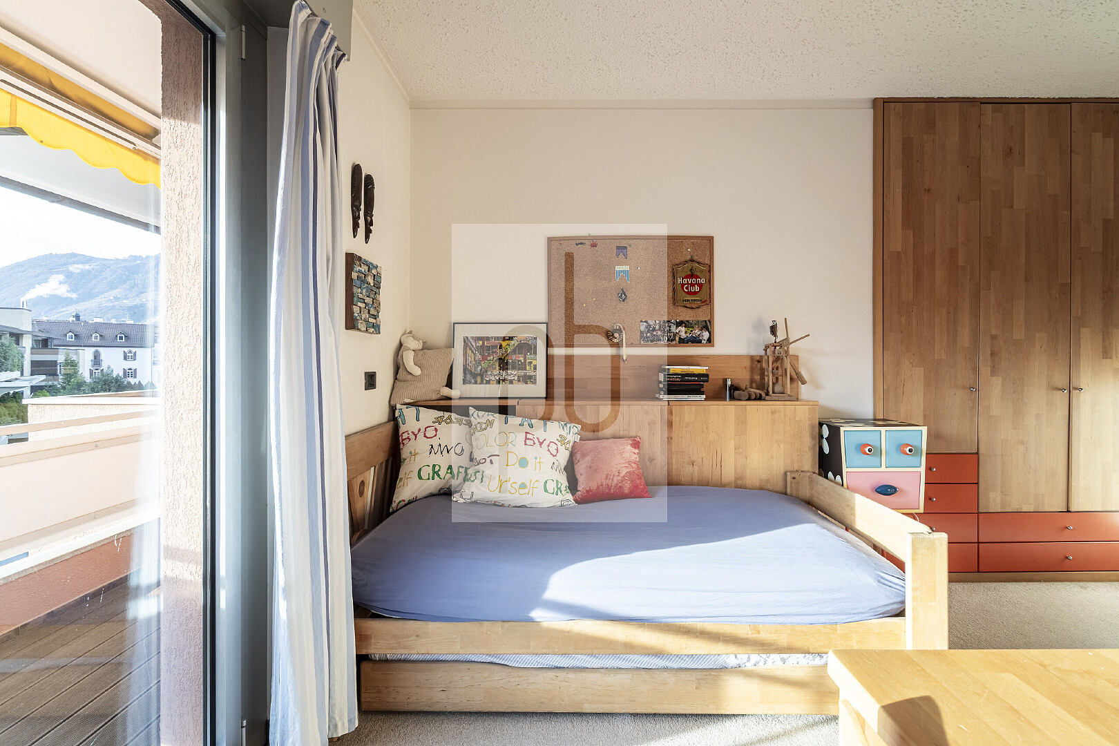 Der Zugang zur Wohnung erfolgt über einen dezent gestalteten Eingangsbereich, der fließend in den großzügigen Wohnbereich übergeht. Dieser präsentiert sich offen, lichtdurchflutet und von eindrucksvoller Großzügigkeit, geprägt durch großflächige Verglasungen, hochwertige Materialien und eine elegante Raumwirkung. Die Panoramaloggia erweitert den Wohnraum nach außen und eröffnet einen freien Blick über die Dächer der Stadt bis hin zur umliegenden Bergwelt – ein geschützter Ort von besonderer Ruhe und Exklusivität. Die großzügige Wohnküche fügt sich harmonisch in das Gesamtbild ein und wird durch den angrenzenden Essbereich zu einem stilvollen Treffpunkt für gesellige Momente. Ergänzt wird diese Ebene durch ein privates Arbeitszimmer sowie einen diskret integrierten Abstellraum, die Funktionalität und Komfort auf höchstem Niveau gewährleisten. Die Master-Suite bildet einen luxuriösen Rückzugsort mit privater Loggia, separater Ankleide und einem en-suite-Bad, mit Sauna- Wellness konzipiert ist und ein Gefühl von Ruhe und Wohlbefinden vermittelt. Über eine interne Treppe erschließt sich die untere Ebene mit zwei großzügigen, hellen Schlafzimmern, die beide Zugang zu einem Panoramabalkon bieten, sowie einem eleganten, tagesbelichteten Badezimmer. Abgerundet wird das Angebot durch eine Garage mit Kellerbereich sowie zwei bis drei private Außenstellplätze in geschützter Lage. Garage und Stellplätze sind nicht im Kaufpreis enthalten.