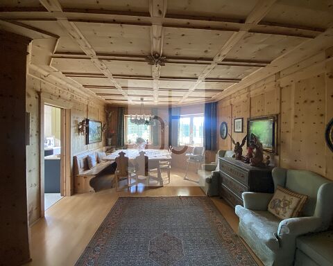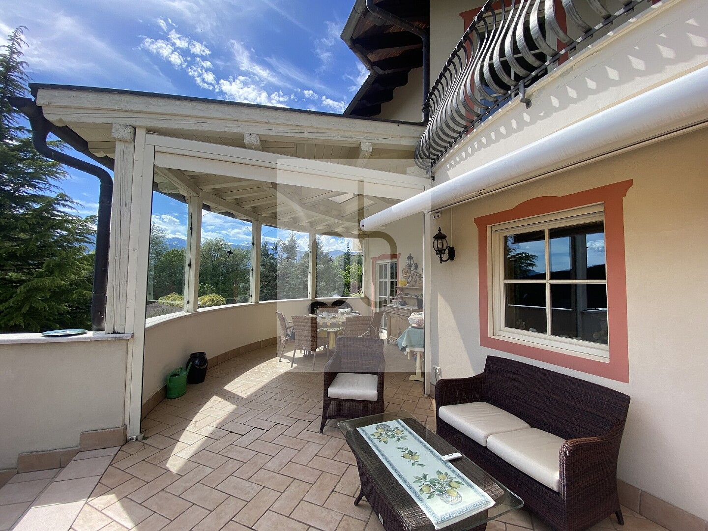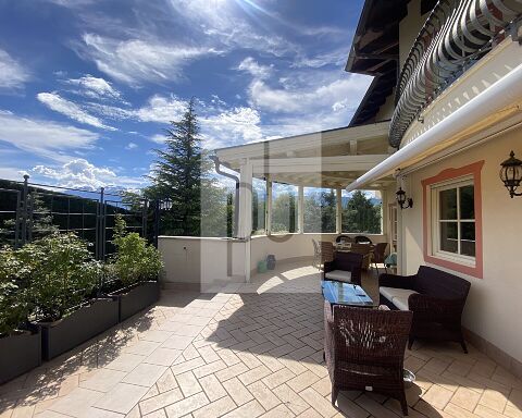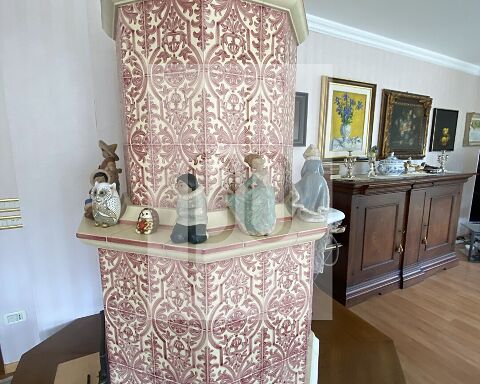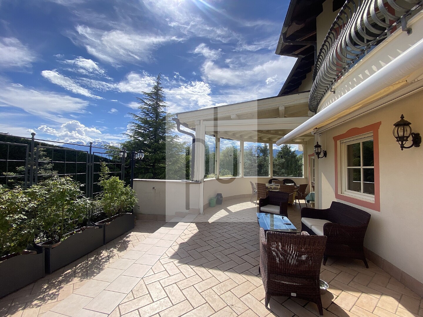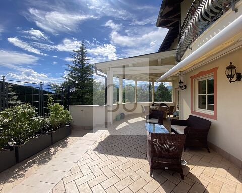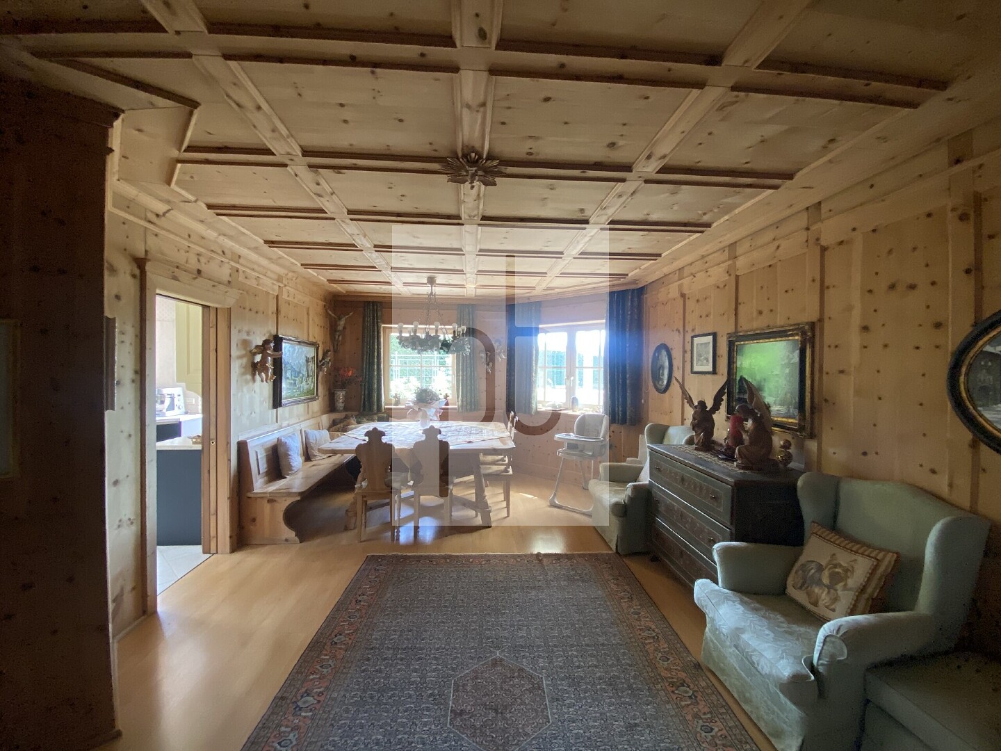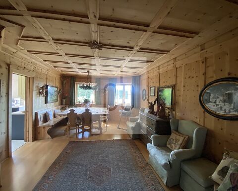 Wohnbereich: Beim Betreten der Villa werden die Gäste von einem geschmackvoll dekorierten Foyer empfangen, das zum großzügigen Wohnbereich führt. Hier öffnet sich eine geräumige, perfekt ausgestattete Küche zu einem hellen Wohnzimmer, das durch Wände und Decken aus Zirbenholz und einen wertvollen Kachelofen der Marke Thun bereichert wird. Ein zweites, luxuriöses Wohnzimmer, ebenfalls mit einem Kachelofen von Thun und einem Kamin ausgestattet, bietet ein elegantes und komfortables Ambiente. Von hier aus gelangt man in eine wunderschöne Veranda, die von großen Glasflächen geschützt ist und einen Panoramablick auf den Pool und den Garten bietet, wodurch eine perfekte Harmonie zwischen Innen- und Außenbereich entsteht.